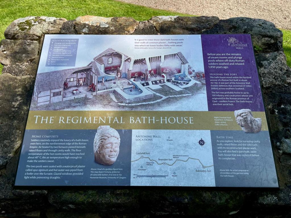 我無去過哈德良長城,因為路途遙遠,接近現時的英蘇邊界,但東安尼長城卻近在咫尺,因為它貫穿了我居住的小鎮──Bearsden,鎮內有一個蘇格蘭保存得最好的羅馬澡堂遺址(Roman Bathhouse),設有熱浴區、溫浴區、冷浴區和更衣區,附近出土了不少羅馬時代的文物,部分收藏於格拉斯哥大學附屬的Hunterian Museum。