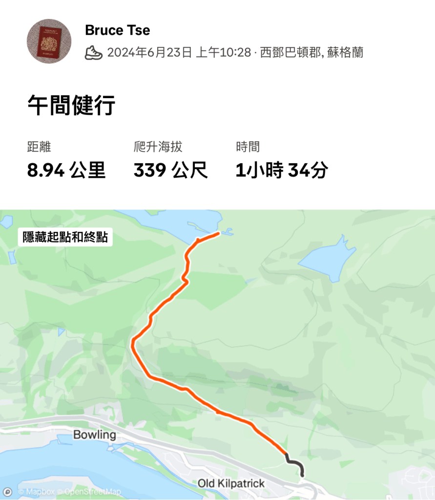 由火車站旁的Kilpatrick Braes Car Park起步,先過橋,經Mount Pleasant Drive轉入Station Road,穿過大西街(大南街個friend,洋文是Great Western Road)的橋底,繼續向前行,直至見到路牌,按指示轉右,開始上山。