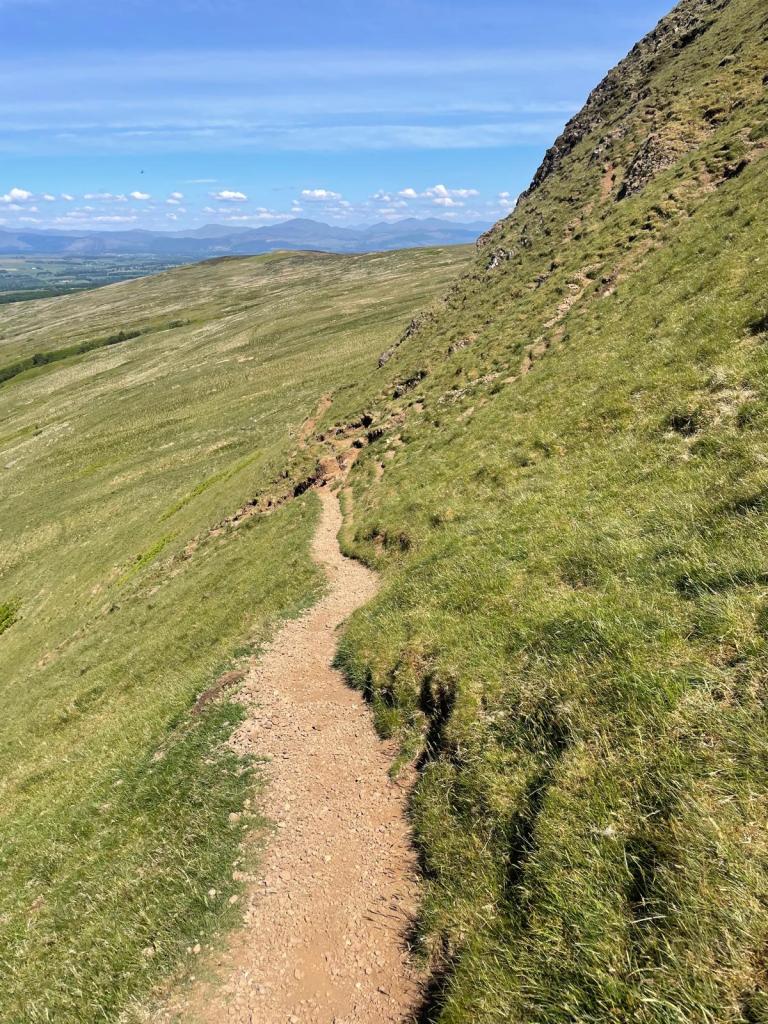 同樣是急斜,中段也有浮沙碎石,怕跣可以踩旁邊的草頭,一直落到底,繼續向前方的Garloch Hill及Earl’s Seat進發,斜度適中,不久即到達Earl’s Seat之巔,也是Campsie Fells的最高點,然後原路折返,回到Dumgoyne: