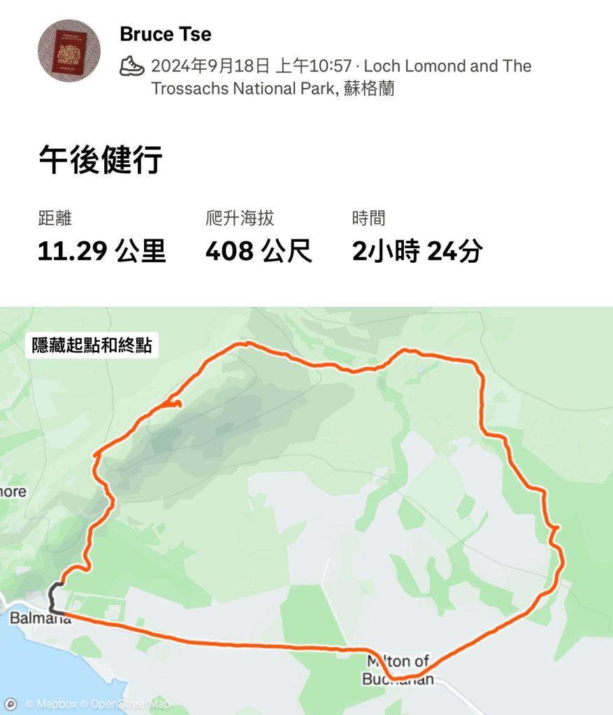 繼續行,前方有支徑攻頂,然後原路落山,接回West Highland Way,面向Loch Lomond,跟out-and-back一樣,最後返回停車場:
