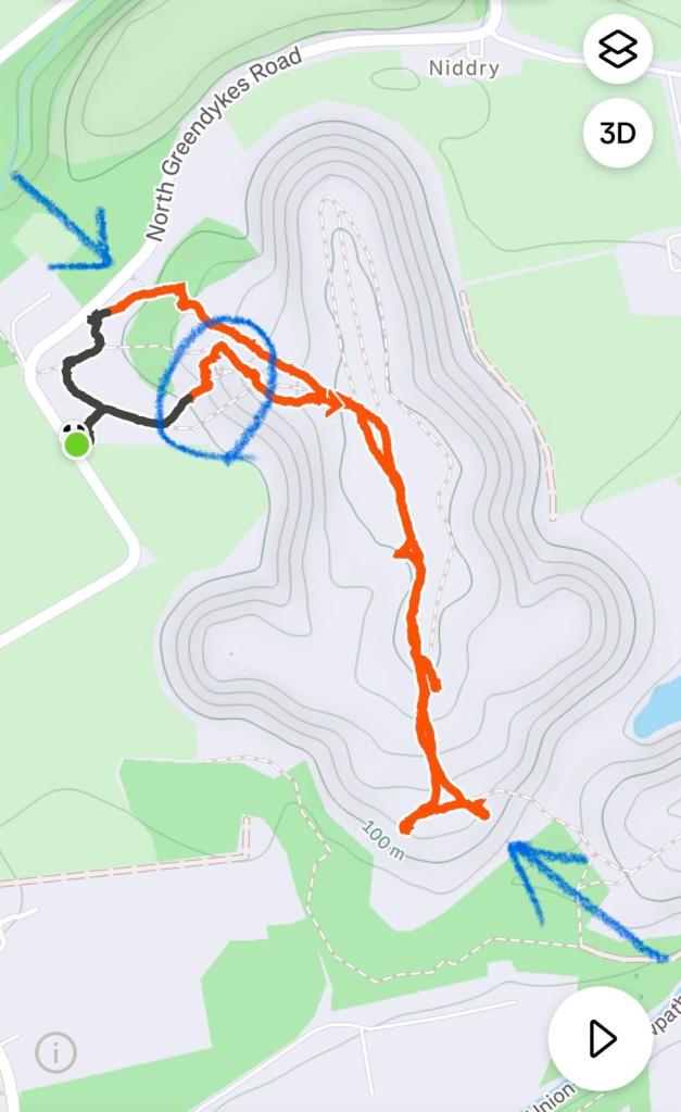 如果大家有興趣到Greendykes Bing行山,建議由一頭一尾起步(藍色箭嘴),緩緩攀升,不要像我由中段爆上(藍圈),極斜極跣,難度直迫杯靈!